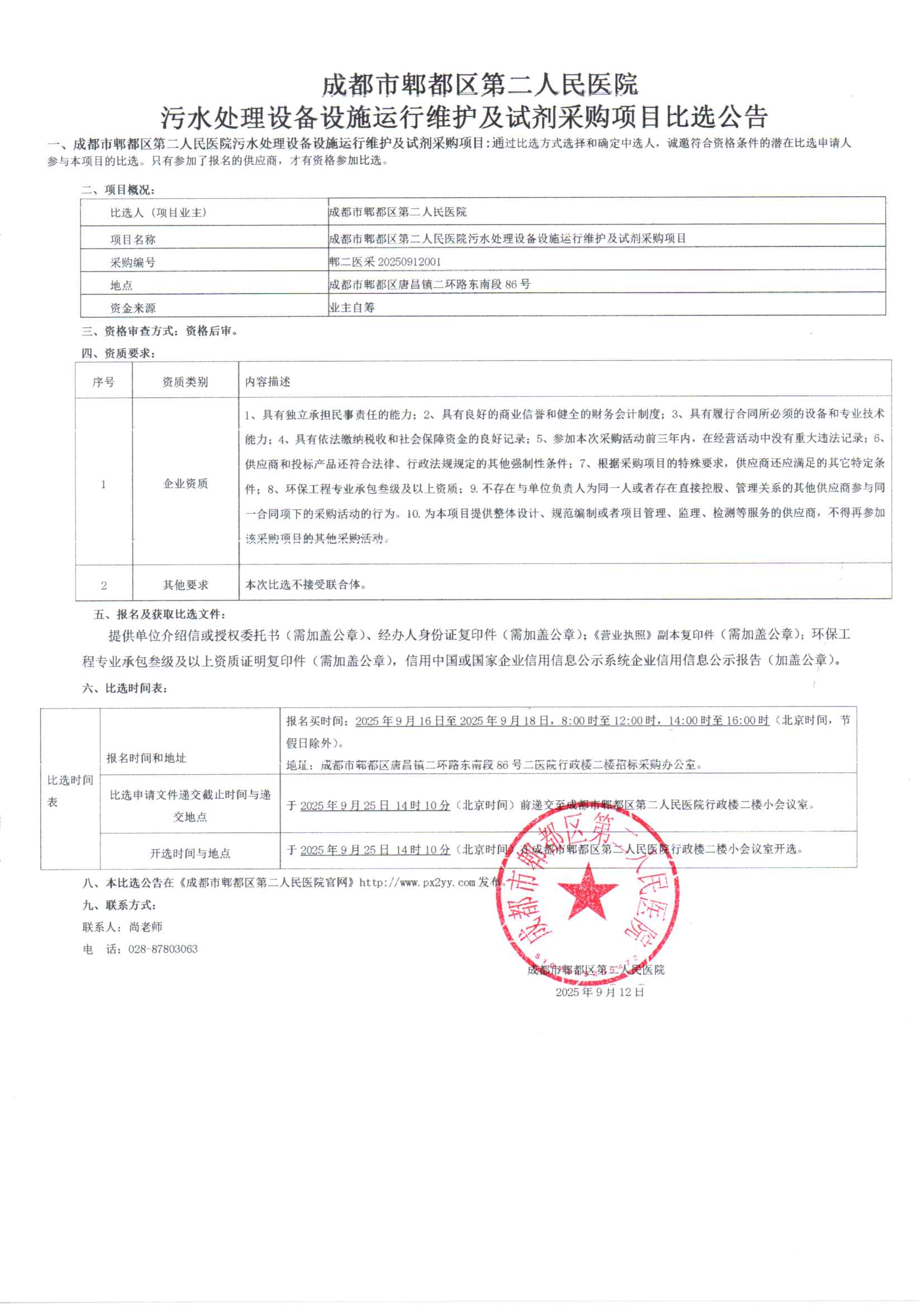 成都市郫都区第二人民医院污水处理设备设施运行维护及试剂采购项目比选公告