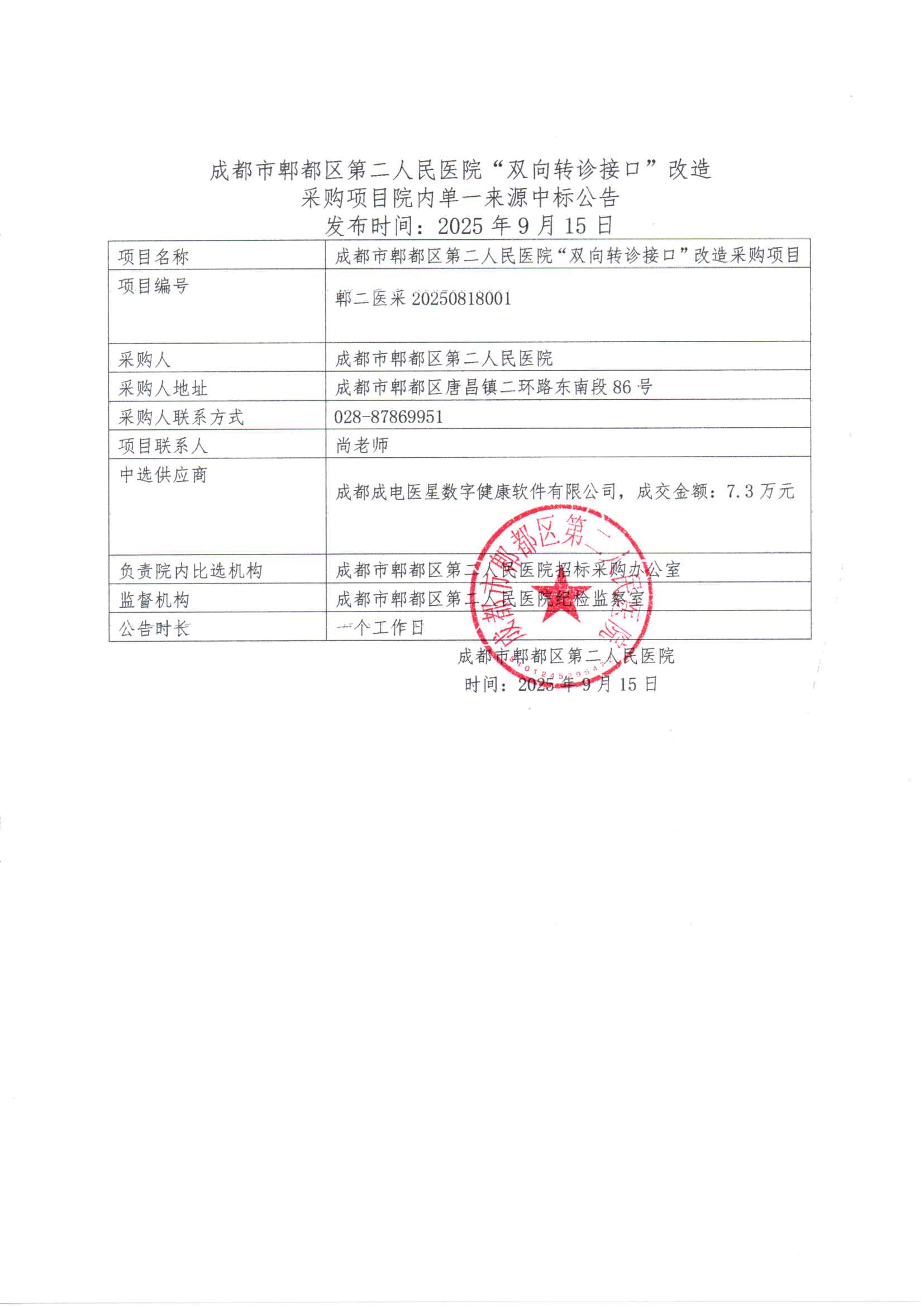 成都市郫都区第二人民医院 “ 双向转诊接口 ” 改造采购项目院内单一来源中标公告