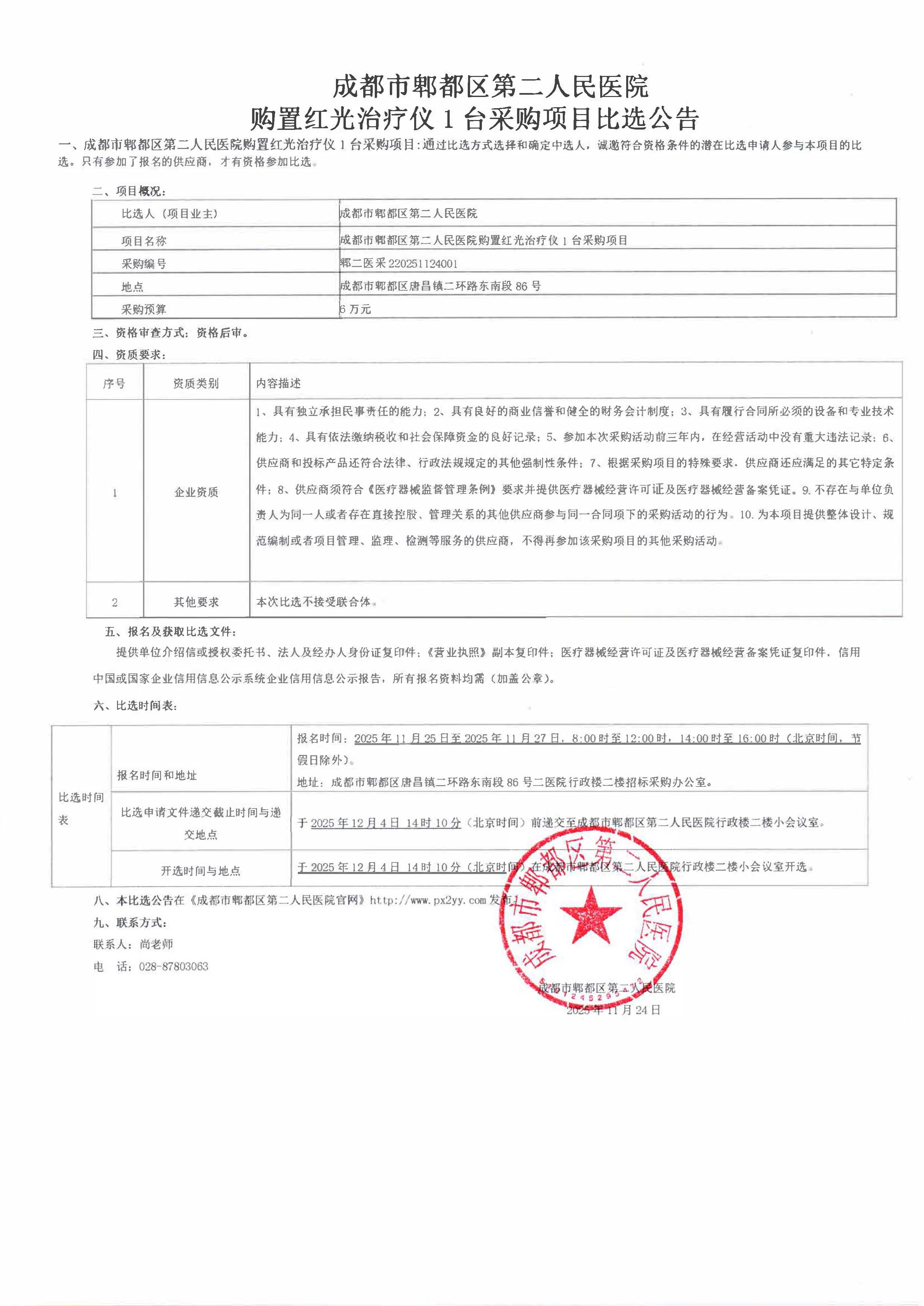 成都市郫都区第二人民医院购置红光治疗仪1台采购项目比选公告