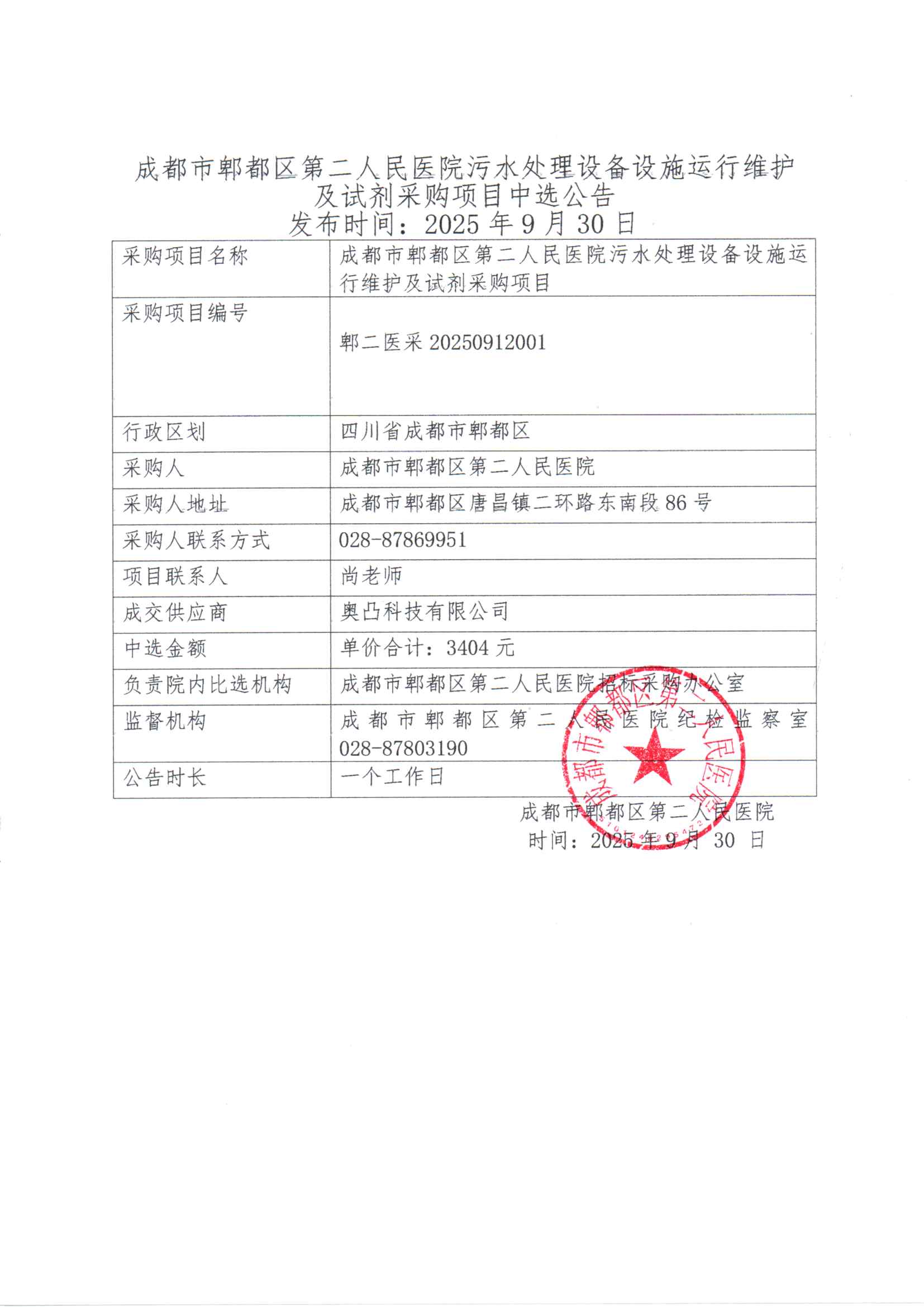 成都市郫都区第二人民医院污水处理设备设施运行维护及试剂采购项目中选公告